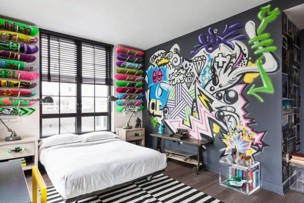 - Musique et Art : Affiches de ses groupes préférés, une guitare accrochée au mur, un tableau noir pour exprimer sa créativité. Jouez avec des couleurs vives comme le rouge, le jaune et le bleu électrique.