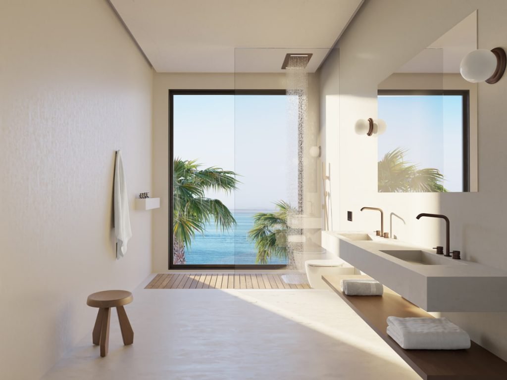 Les sols et les murs en béton ciré beige offrent une base neutre et élégante pour votre salle de bain. Vous pouvez jouer avec différentes textures et finitions pour personnaliser l’espace.