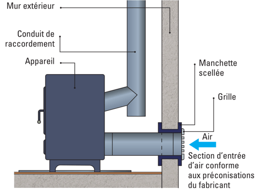 - Raccordement à l’air extérieur : Le conduit d’arrivée d’air doit être dimensionné correctement et protégé contre les intempéries.