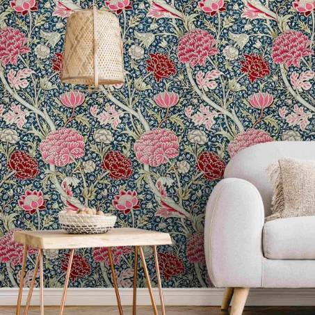 Le papier peint William Morris se distingue par ses motifs inspirés de la nature, ses couleurs douces et harmonieuses, et ses techniques d’impression artisanales, lui conférant une qualité et une profondeur uniques.